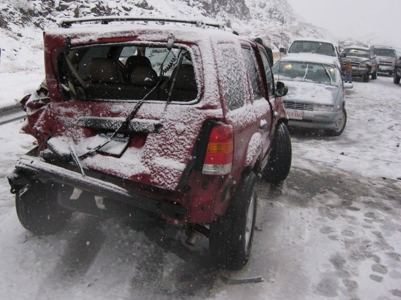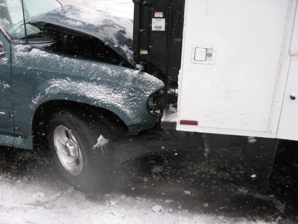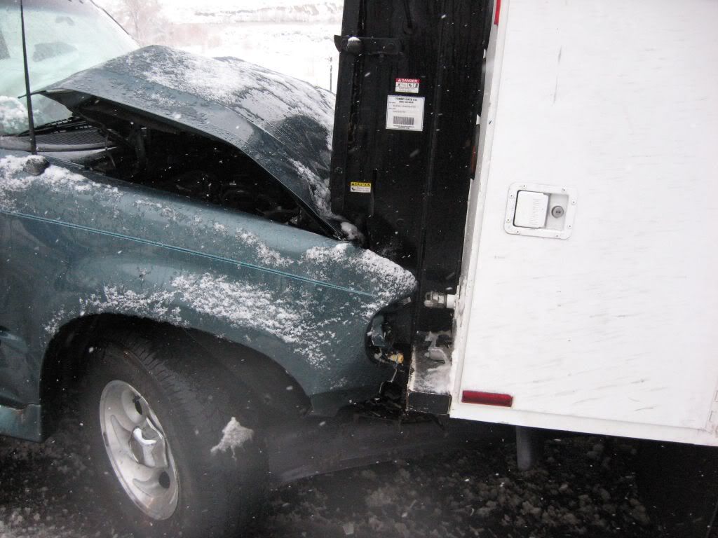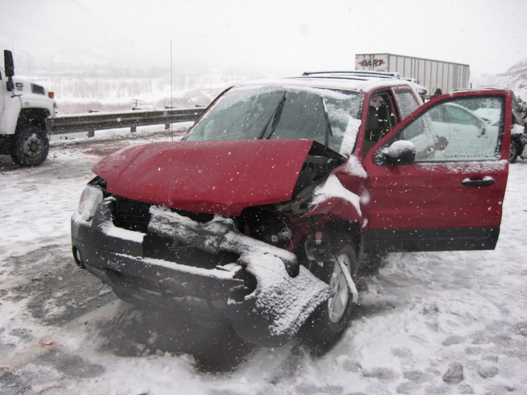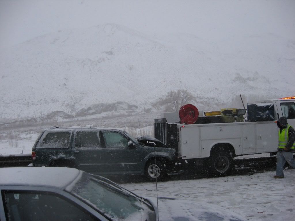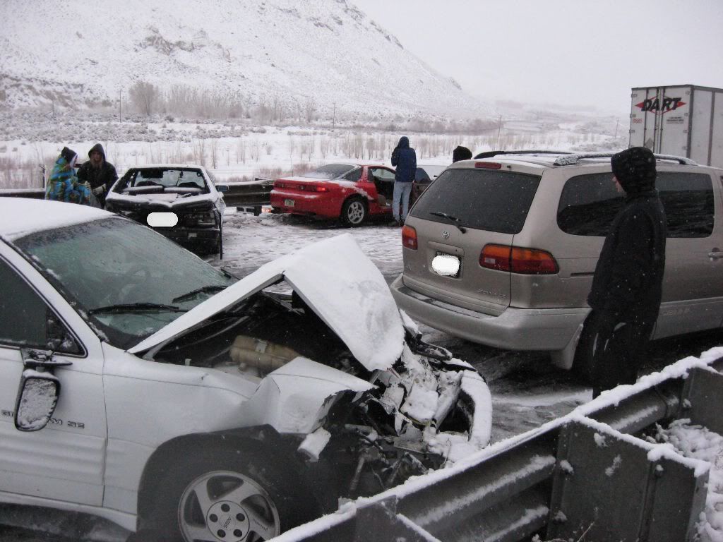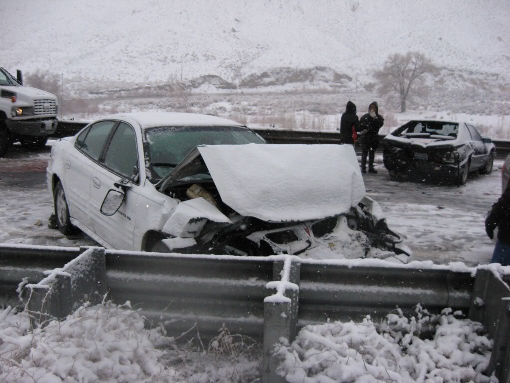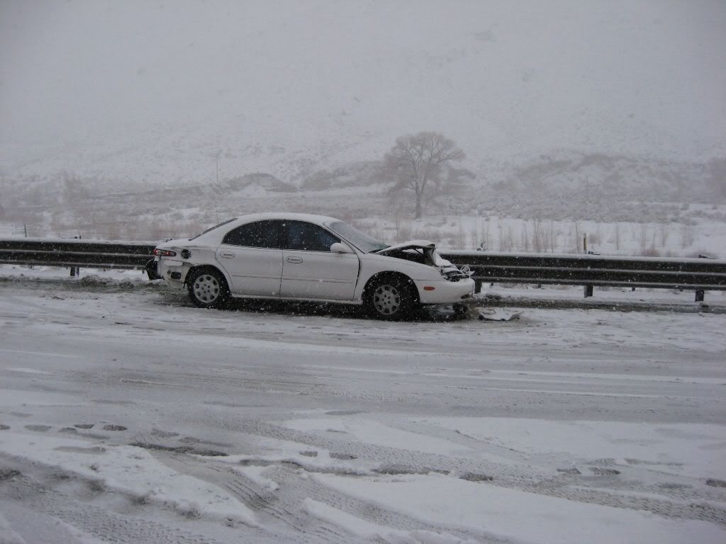 So, here's the story. A family member had been admitted to ICU under critical condition so we had to go. I was at home for winter break and I was scheduled to go back to Reno this weekend anyways because I have work on Monday. So, I was driving the Taurus with my sisters and my parents were following in the Windstar (they were about 15 miles behind us). The weather was fine when we left. A little cloudy, but no snow. Once we got to the interstate it started to snow. Not too bad still, just light flurries. We got to about 10-15 miles before of Reno and all of a sudden there was a white-out! Snow came down hard and there was no visibility. I was shocked some people were driving without their headlights on. So I'm going 55 MPH in the right lane following the tire tracks in front of me (which I couldn't see the vehicle). I get past this hill and coast down the other side. All of a sudden, I see brake lights in the distance. I get on the brake and the lights were approaching me fast! I pumped the pedal to flash my lights to warn whoever was behind me and then nailed the pedal as hard as I could. I knew at that moment that we were going to be in an accident. I was determined not to wreck this car so I was going to aim it at the softest thing I see since there was no way it's going to stop by itself with ABS. I caught a glimpse of a break in the guardrail and in a split second I turned the wheel to aim the car at the gap. I came within millimeters of nailing the guardrail head-on. I saw a pole and thought "This is going to hurt", but luckily that pole was made of plastic so the Taurus hit it with no resistance. The car went up on the rocks and stopped harsh and sudden.