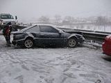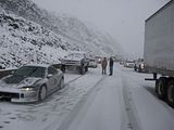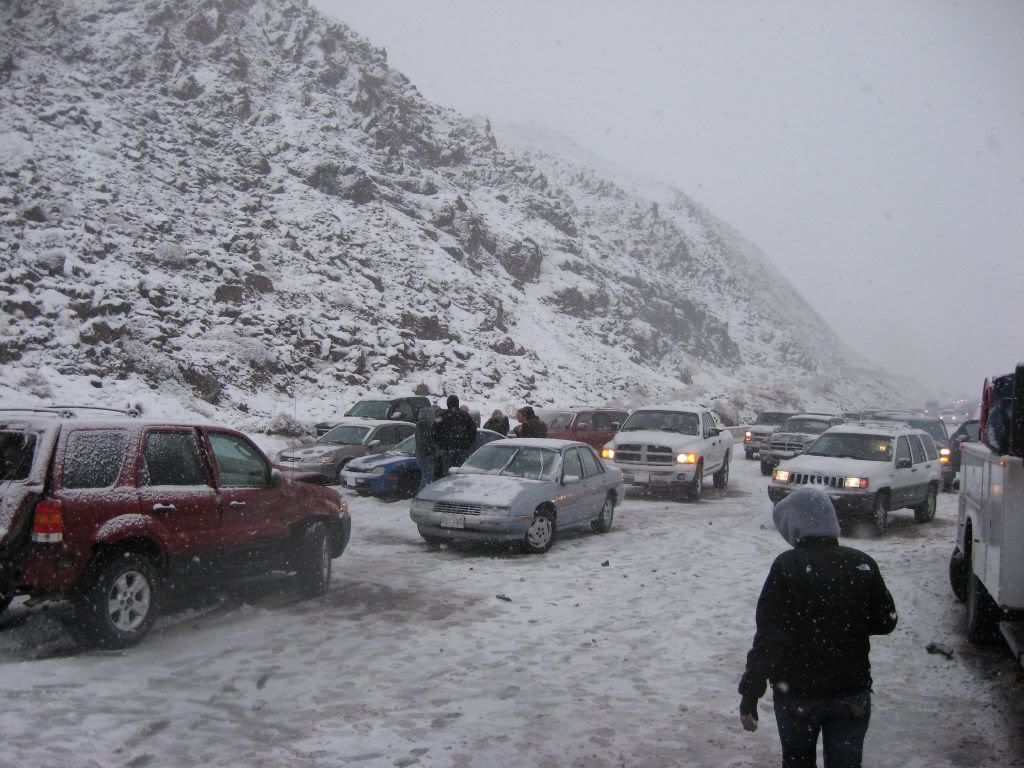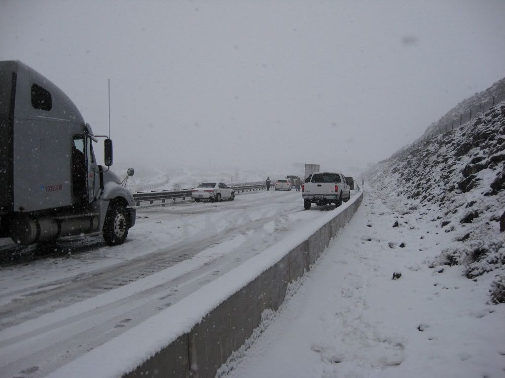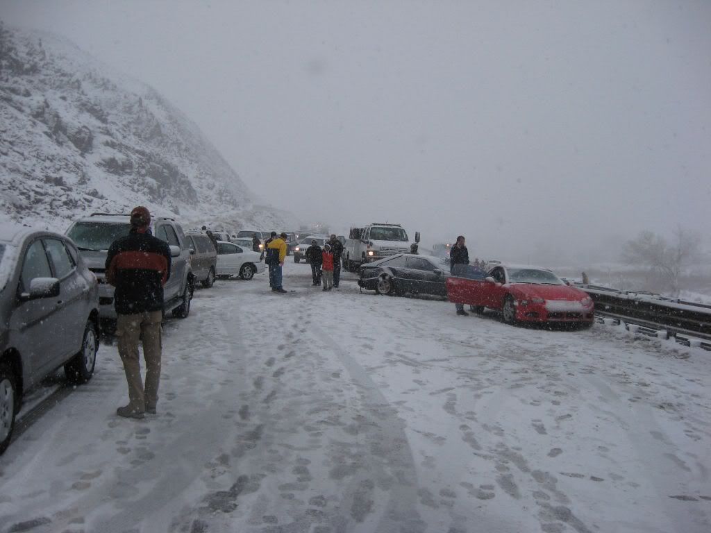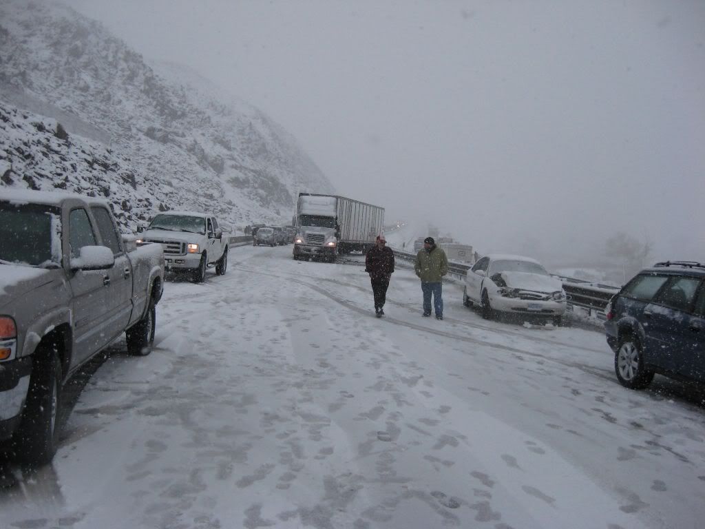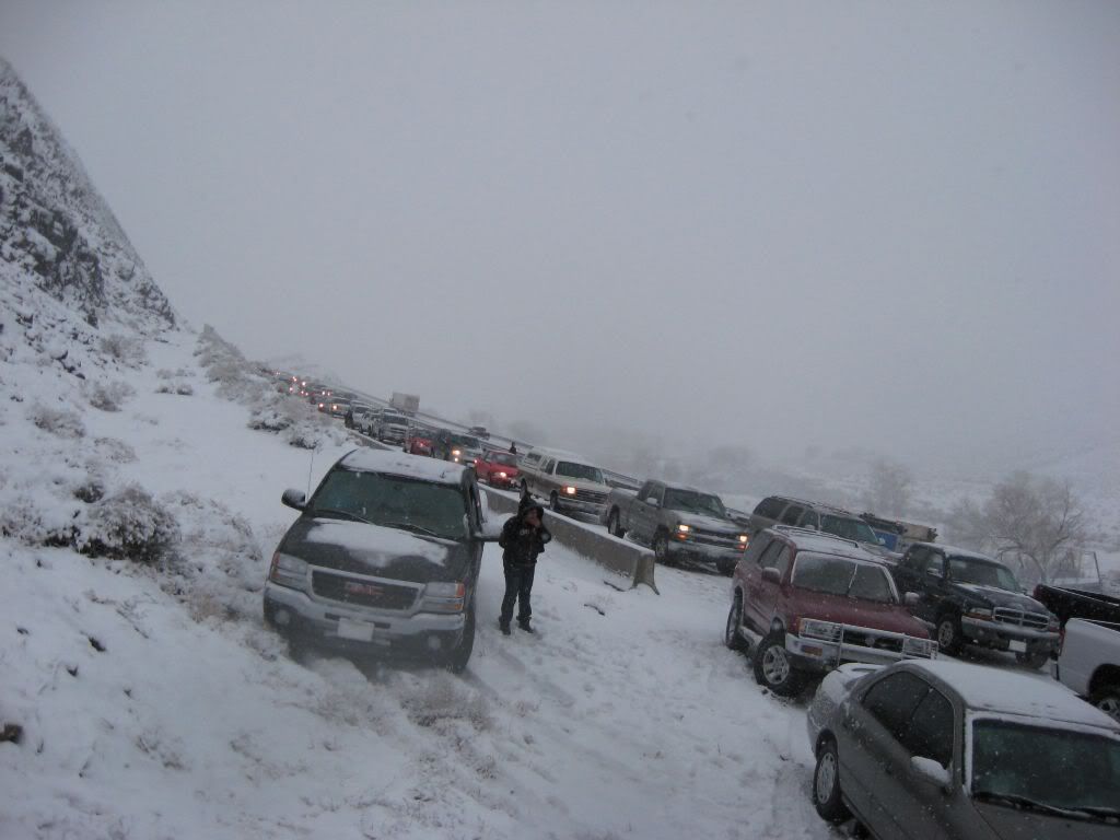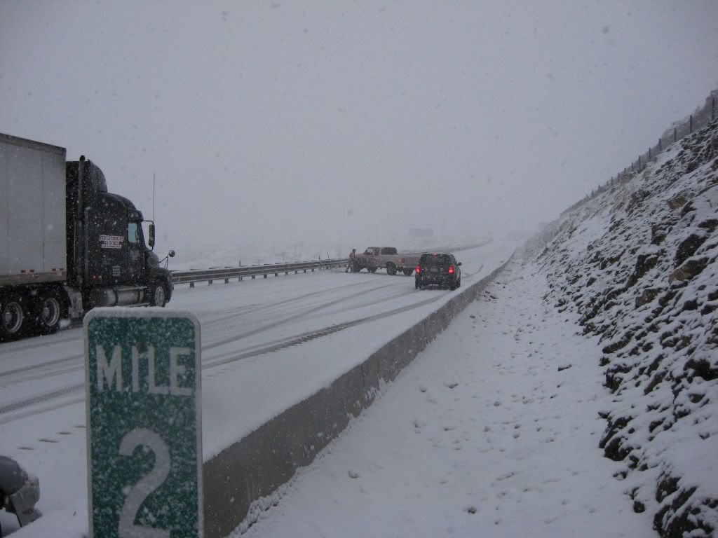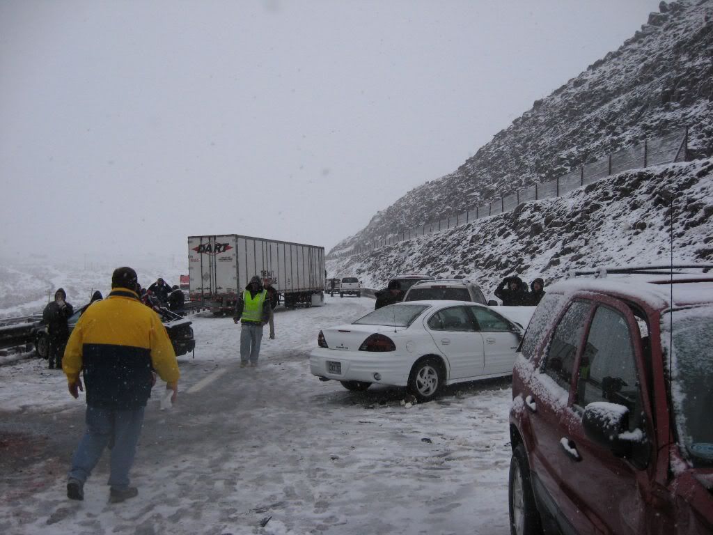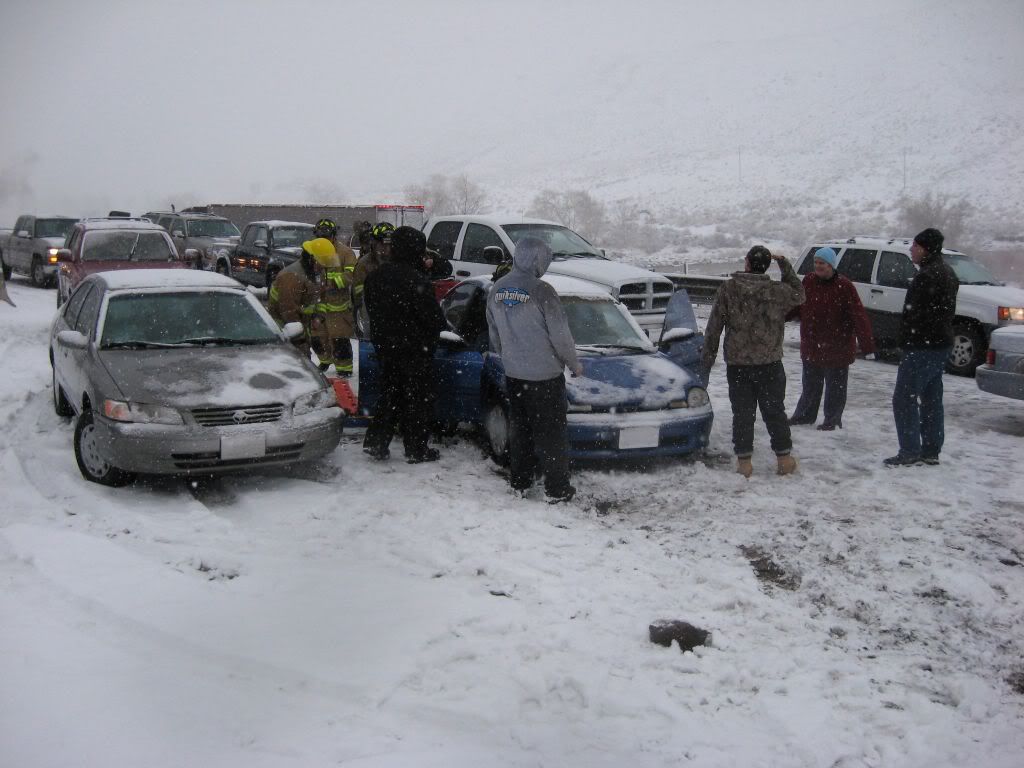 So, here's the story. A family member had been admitted to ICU under critical condition so we had to go. I was at home for winter break and I was scheduled to go back to Reno this weekend anyways because I have work on Monday. So, I was driving the Taurus with my sisters and my parents were following in the Windstar (they were about 15 miles behind us). The weather was fine when we left. A little cloudy, but no snow. Once we got to the interstate it started to snow. Not too bad still, just light flurries. We got to about 10-15 miles before of Reno and all of a sudden there was a white-out! Snow came down hard and there was no visibility. I was shocked some people were driving without their headlights on. So I'm going 55 MPH in the right lane following the tire tracks in front of me (which I couldn't see the vehicle). I get past this hill and coast down the other side. All of a sudden, I see brake lights in the distance. I get on the brake and the lights were approaching me fast! I pumped the pedal to flash my lights to warn whoever was behind me and then nailed the pedal as hard as I could. I knew at that moment that we were going to be in an accident. I was determined not to wreck this car so I was going to aim it at the softest thing I see since there was no way it's going to stop by itself with ABS. I caught a glimpse of a break in the guardrail and in a split second I turned the wheel to aim the car at the gap. I came within millimeters of nailing the guardrail head-on. I saw a pole and thought "This is going to hurt", but luckily that pole was made of plastic so the Taurus hit it with no resistance. The car went up on the rocks and stopped harsh and sudden.
